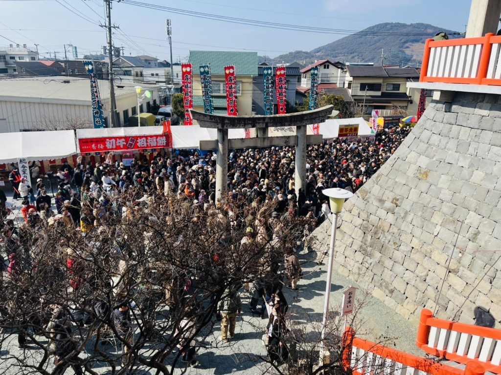 その後12時から『福餅まき』では、福男と福娘らがまく餅に参拝者が競うように手を伸ばして大きな歓声で賑わっていました。